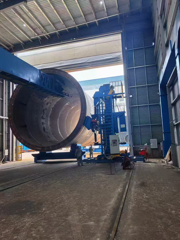 1. 工件就位:塔筒通過(guò)吊裝設(shè)備放置在輸送輥道上,進(jìn)入拋丸室后,兩端支撐裝置固定并啟動(dòng)旋轉(zhuǎn)。